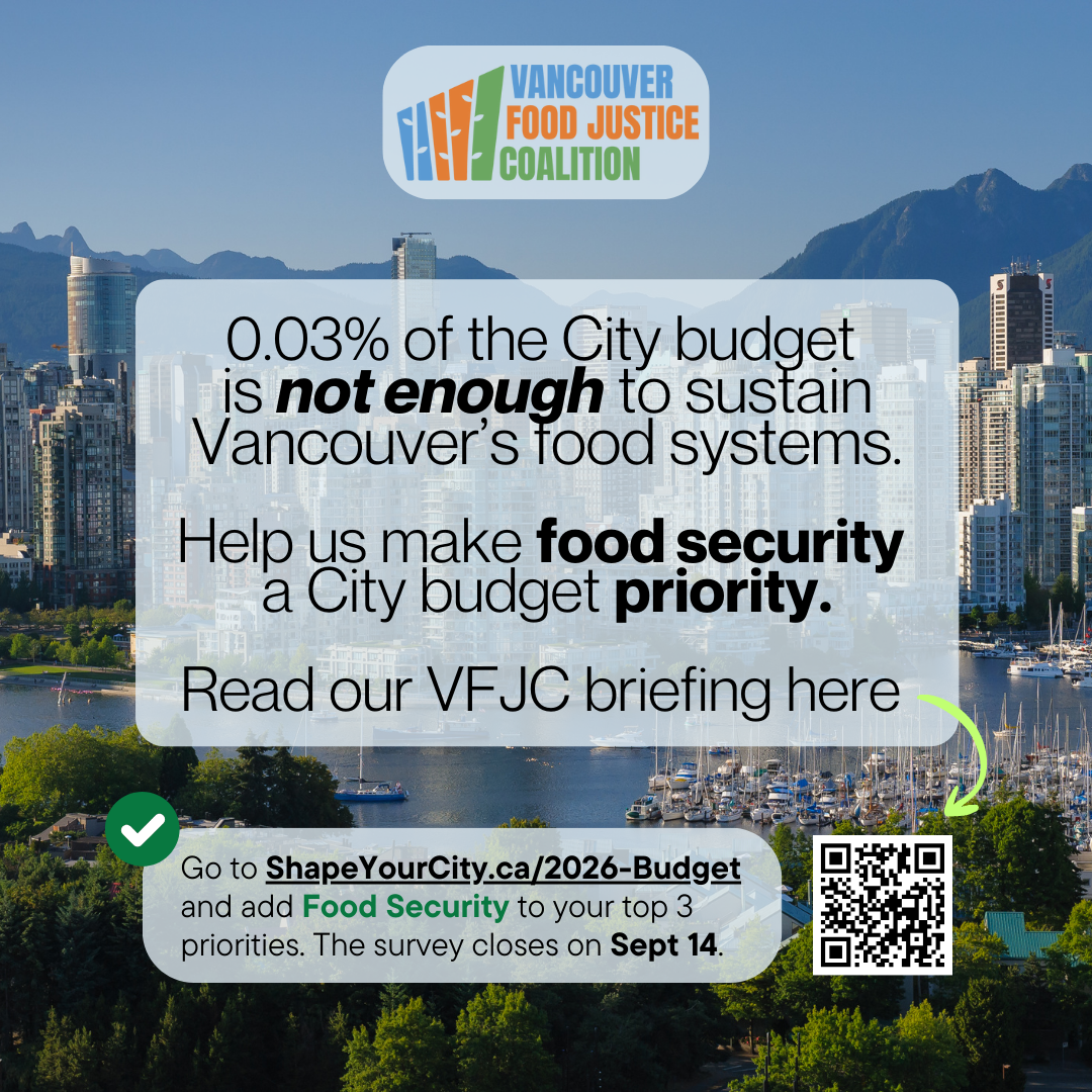 Each year, City of Vancouver staff prepare an operating and capital budget. The City is now seeking public input on where they should spend tax dollars as well as ideas on how to balance the budget. Food security is a growing issue from the local to the global as our food systems are increasingly under pressure. For many people in Vancouver, the cost of living and food inflation is driving high rates of food insecurity.