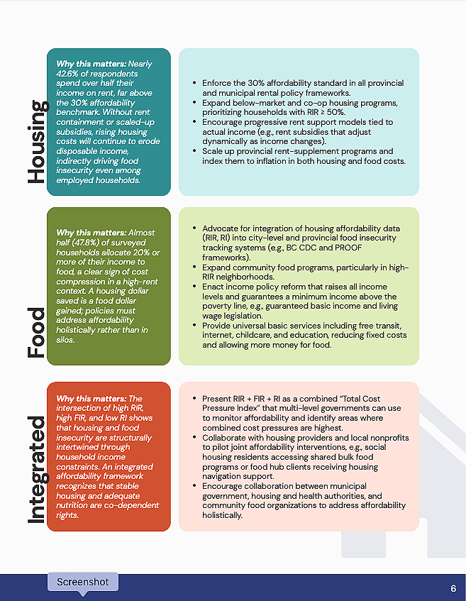 Tackling this dual burden requires collaboration across policy domains. A coordinated approach linking housing strategies, rent supports, and community food programs is essential to safeguard household well-being. This calls for joint planning between the City of Vancouver, BC Housing, Vancouver Coastal Health, community organizations and others to create integrated affordability solutions.